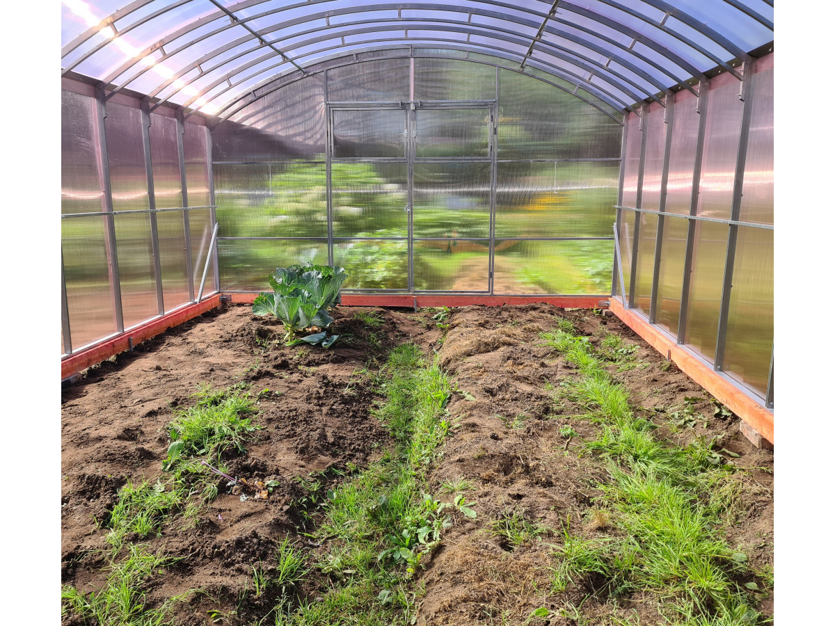 • широкая 4 м, ширина теплицы позволяет организовать 3 широкие полноценные грядки с комфортными проходами между ними;